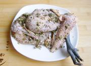 鸡洗净擦干,用炒好的葱椒盐均匀地抹擦,量不能少,能保证让鸡的表面都粘上葱椒盐。