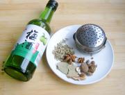 将抹好的鸡放入大保鲜盒,加入拍碎的姜与葱,倒入梅酒,盖上盖,放入冰箱,腌8小时以上。