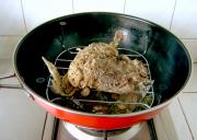 放一个铁箅子,将鸡(皮 向下)摆在箅子上,盖好锅盖,熏10分钟,再关火,继续盖着盖子熏15分钟。