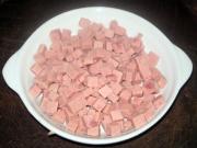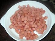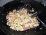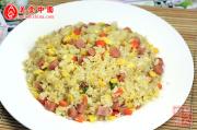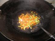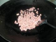 将火腿粒、玉米粒、青豆、胡萝卜入锅一起炒匀,加适量的盐调味、滴几滴蚝油炒匀就行了。