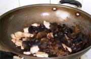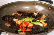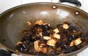 至肉片变成微黄色时,倒入木耳。