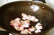 加热后下入五花肉煸炒。