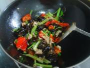倒入木耳,香芹,调入料酒翻炒,调入生抽,鸡粉炒匀。