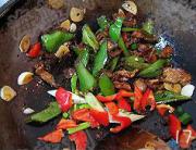 待肉7成熟时,加入大蒜片,杭椒,红椒,美人椒,将火调大。