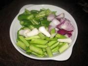 将洋葱、尖椒、青蒜切段待用。