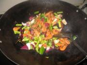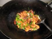 加入洋葱、尖椒、青蒜炒至断青。