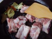 下入排骨、冰糖放入锅中炒至棕红色,排骨上色。