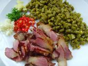 腊肉洗净,切片;葱姜蒜切碎备用。