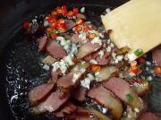 锅置火上少许油烧热,将腊肉炒香,肥肉部分炒至透明色。