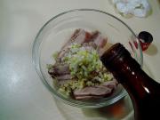 把卤五花肉方切成大片,里面撒上少许盐、味精和白糖。