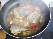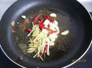 利用煎鱼剩的油,放入姜、干红椒、蒜炒香。