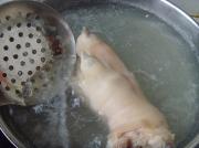 捞出后迅速将猪手丢入准备好的凉水中冲洗片刻,使猪手更富有弹性。