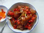 待猪手上色后撒入白胡椒、剁椒、葱、姜丝、少许蒜米,淋入红油翻炒几下盛出入盘。