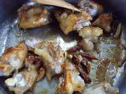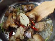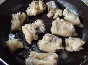 下入煎炸过的猪手块,加入绍酒、盐、红辣椒、八角、香叶、少许酱油煸炒。