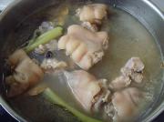 用修眉镊去毛,锅置火上下入猪手煮至10分钟祛除血末捞出。