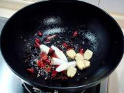 煸出香味儿后下入葱段、姜片和干辣椒煸炒。