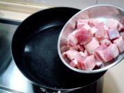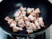 把五花肉块用中小火煸出油,肉块煸至颜色微黄捞出备用。
