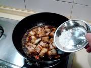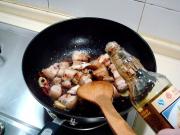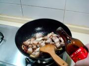 爆出香味儿后,倒入煸好的五花肉块炒匀,然后烹入绍酒炒匀。