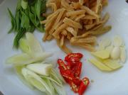蒜苗洗净切段,红辣椒切碎,装盘备用。