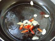 锅置火上油烧热,煸香葱姜蒜片,再放入豆豉、辣椒,爆香。
