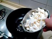 把茭白煸炒至颜色微黄烹入黄酒。