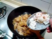 倒入什锦海鲜料炒匀,然后用旺火翻炒数下。