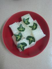 冬瓜去皮切成长方块,再切成十字刀花,冬瓜皮刻成树叶的样子待用(简易做法:直接连皮切成大块即可)。
