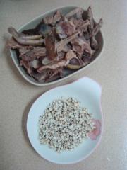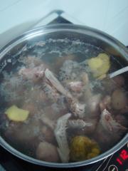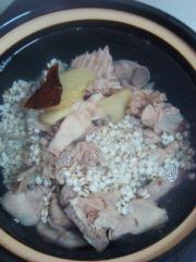 沙锅里放入鸭块、薏米、陈皮、姜片,烧开后改小火煲1个半小时。