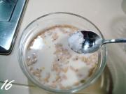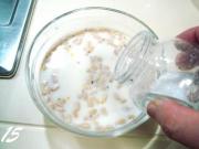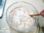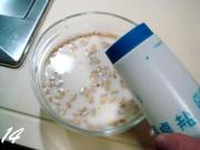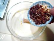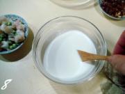 把切好的火腿粒和松子仁倒入搅拌好的牛奶里。