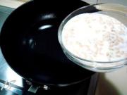 炒勺烧热,注入适量凉油,油温三四成热时倒入搅拌好的牛奶。