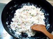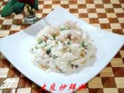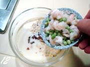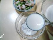 把飞水后的虾片和青豌豆倒入牛奶里。