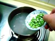 虾片下锅后倒入青豌豆一同飞水,当虾片卷曲时捞出备用。