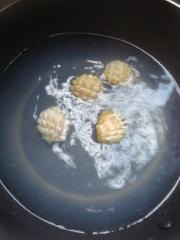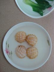 小棠菜捞起后,再放入鲍鱼焯水,鲍鱼身往内卷即可。