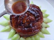 扣肉取出滗出原汤,把肉扣在盘内。