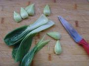 油菜洗净,取根部切成花瓣状。