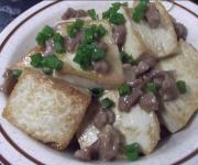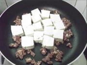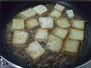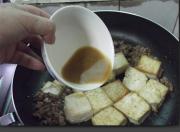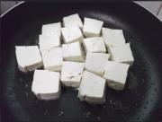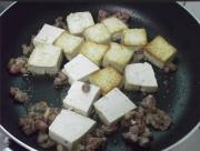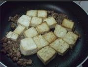 豆腐煎至金黄色,加入肉丁在旁边煎。