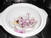 砂锅放油烧热,放入葱白,姜片,蒜和洋葱爆香。