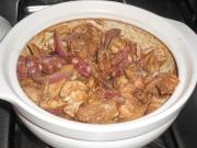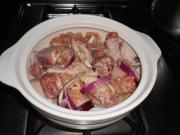 倒入鸡块里,放入腊肠拌炒均匀,转小火焖烧20分钟至鸡熟透。中途要勤翻拌防止粘锅。