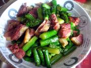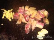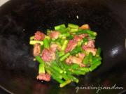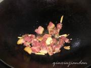 起油锅,爆香姜蒜,下腊鸭煸炒至变色。