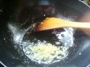 锅里留底油,葱、姜切末放入锅中煸炒。