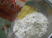 将玉米面、淀粉、面粉放入盆里,加入少许盐搅拌均匀。