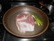将五花肉洗净,然后凉水下锅,放入葱姜和1茶匙料酒,慢慢煮至肉变色,用筷子扎一下没有血水溢出,肉质大约7成熟;