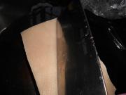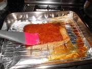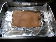 看到肉皮表面开始变黄起焦后取出,把锡箔纸拿开,用刀将表面的黑色焦化物刮干净。