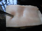肉煮熟后立即捞出过凉水洗干净,用镊子把毛拔干净,再用刀将肉皮上的白膜和杂质刮干净。