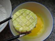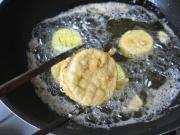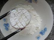 锅中倒入植物油烧至4成热时,将腌好的茄片拍上干淀粉。