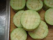 茄子洗净去皮,切成约1CM厚的片,表面切十字花刀(两面都切),青红椒切小滚刀块备用。