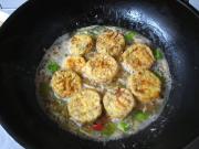 倒入茄片烧至茄子软透入味,起锅前勾薄芡,放入青蒜段炒匀即可。