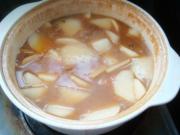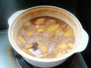 锅里放油,放入姜片煎制成金黄色,放入砂锅中。