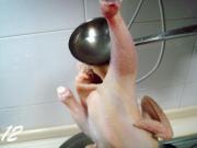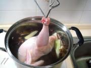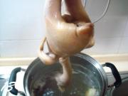 然后,再次把鸡浸入到热汤中进行烫制,然后再次拎出向鸡腹内灌入热汤,共反复七次操作。