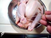 把子鸡的腿骨端用线绳拴好。